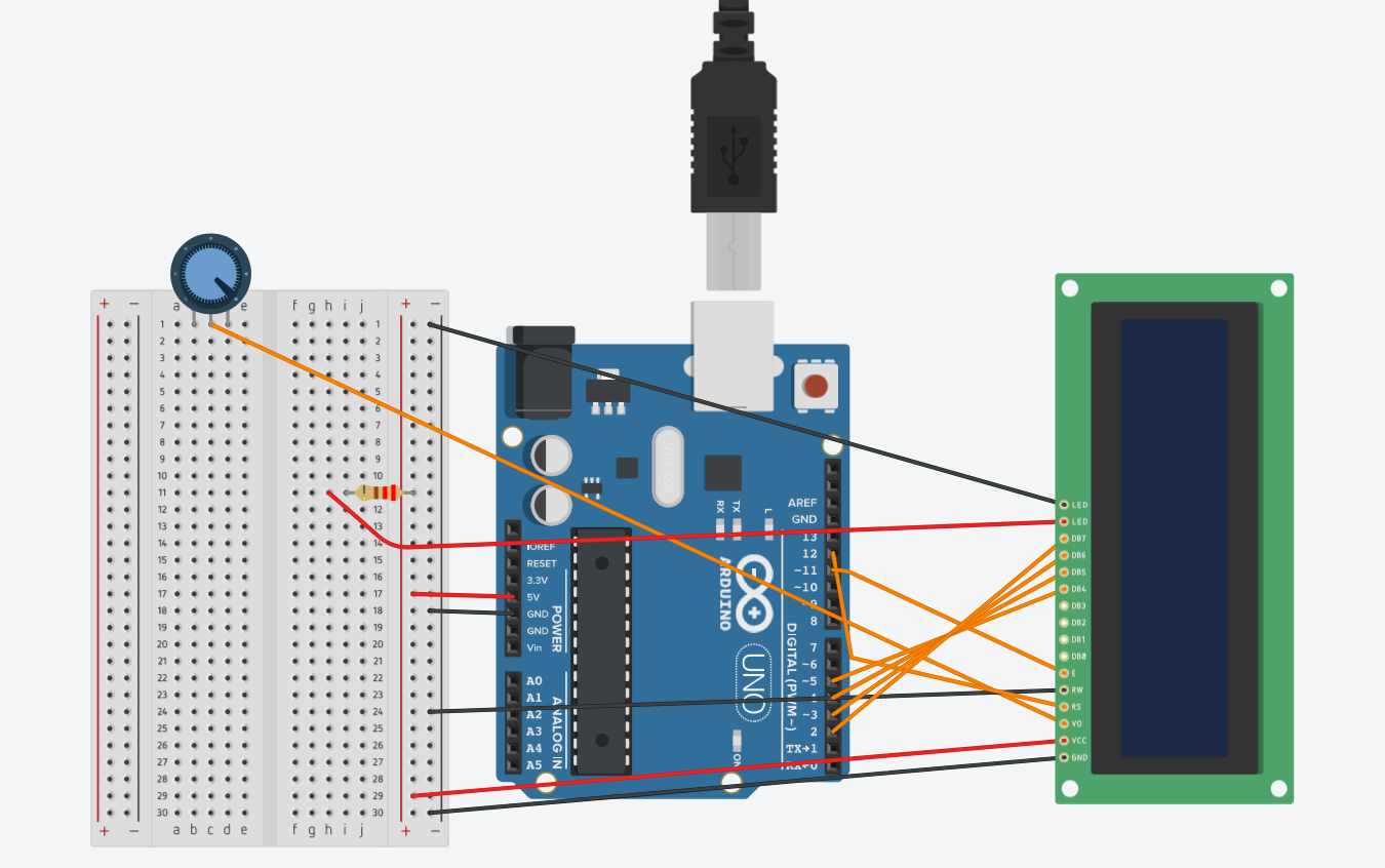 Then, here is a better wiring diagram made with Tinkercad. There was a slight problem though, because Tinkercad doesn't have some of the components that I used, like the DHT11 temperature and humidity sensor, so I could only show what the LCD wiring looked like. As for the remaining sensors, I used digital pin 7 for the DHT11 sensor and pins ~9 and 8 for the CO module and buzzer.